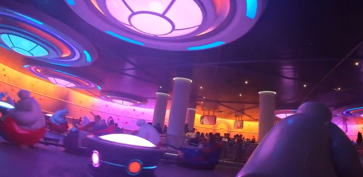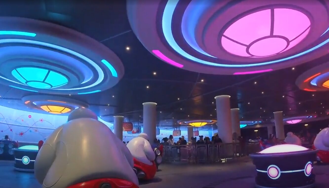 ベイマックスにそっくりなケア・ロボット(ベイマックスをヒロが量産?)が引っ張るライドに乗り込むと、軽快な音楽と共に予測不能な動きで振り回されます!